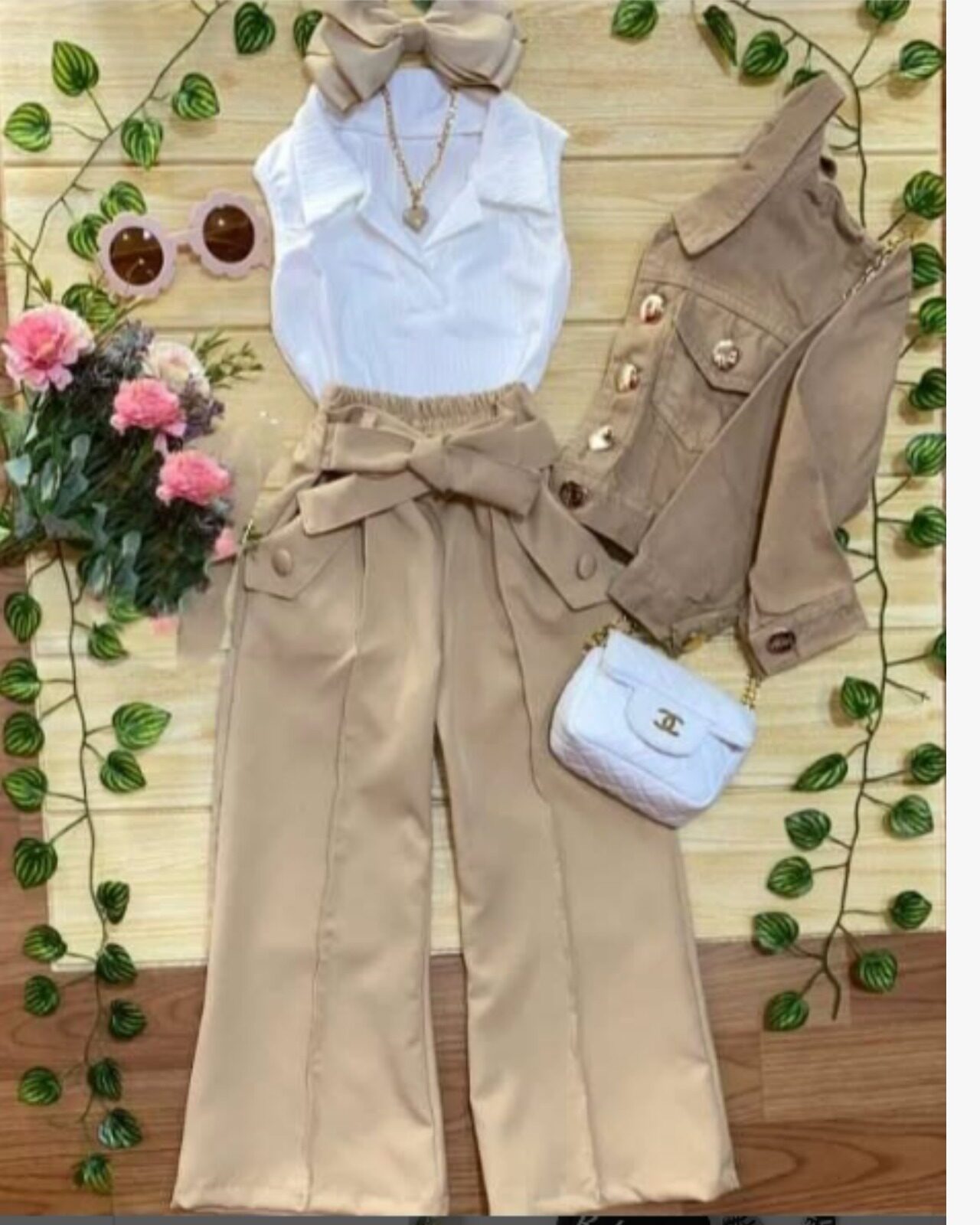 Un conjunto adorable y sofisticado, perfecto para lucir con estilo en cualquier ocasión. 💕 Incluye blusa blanca con cuello clásico, pantalón beige con moño y chaqueta a juego, creando un look moderno, cómodo y lleno de encanto. 🌸